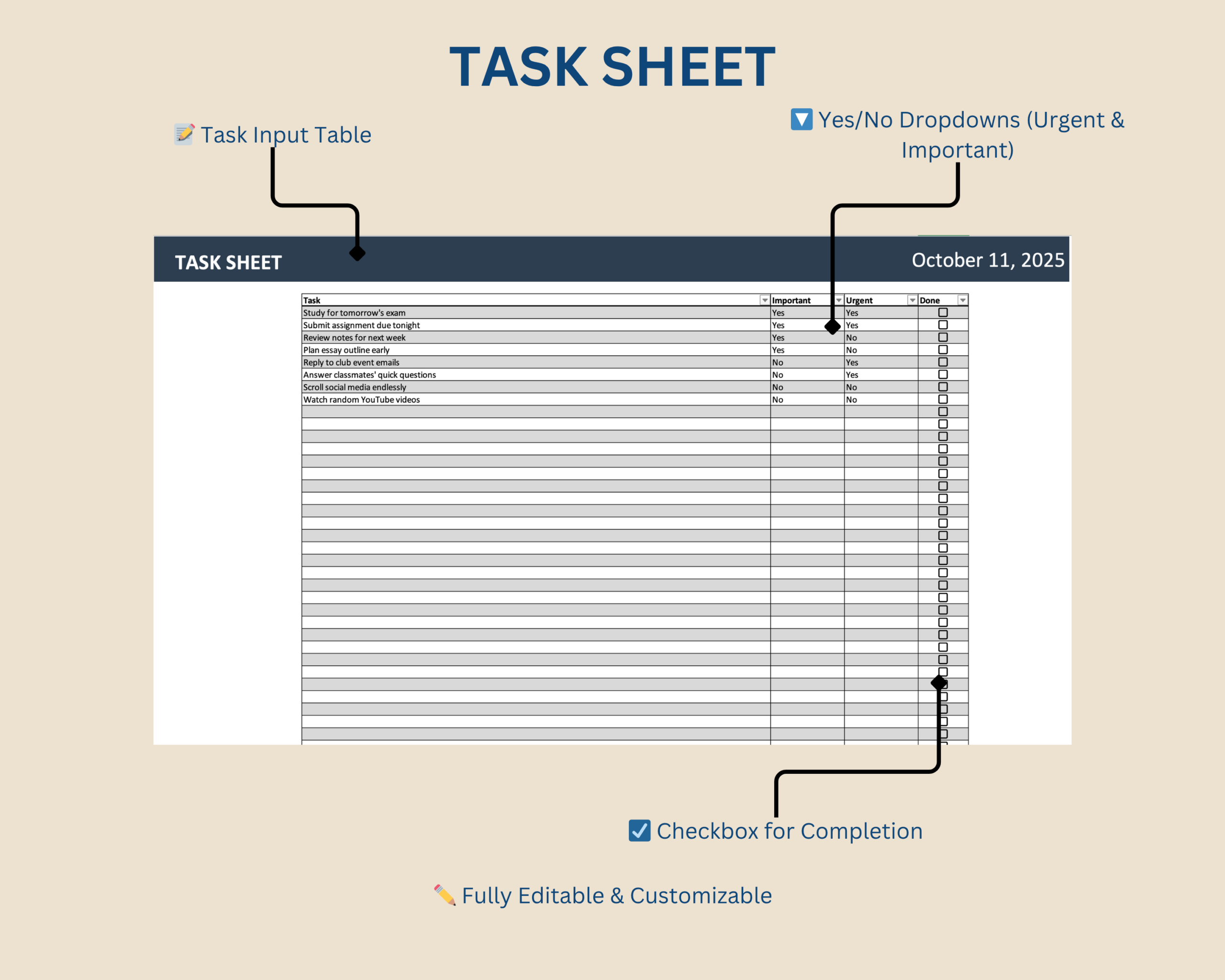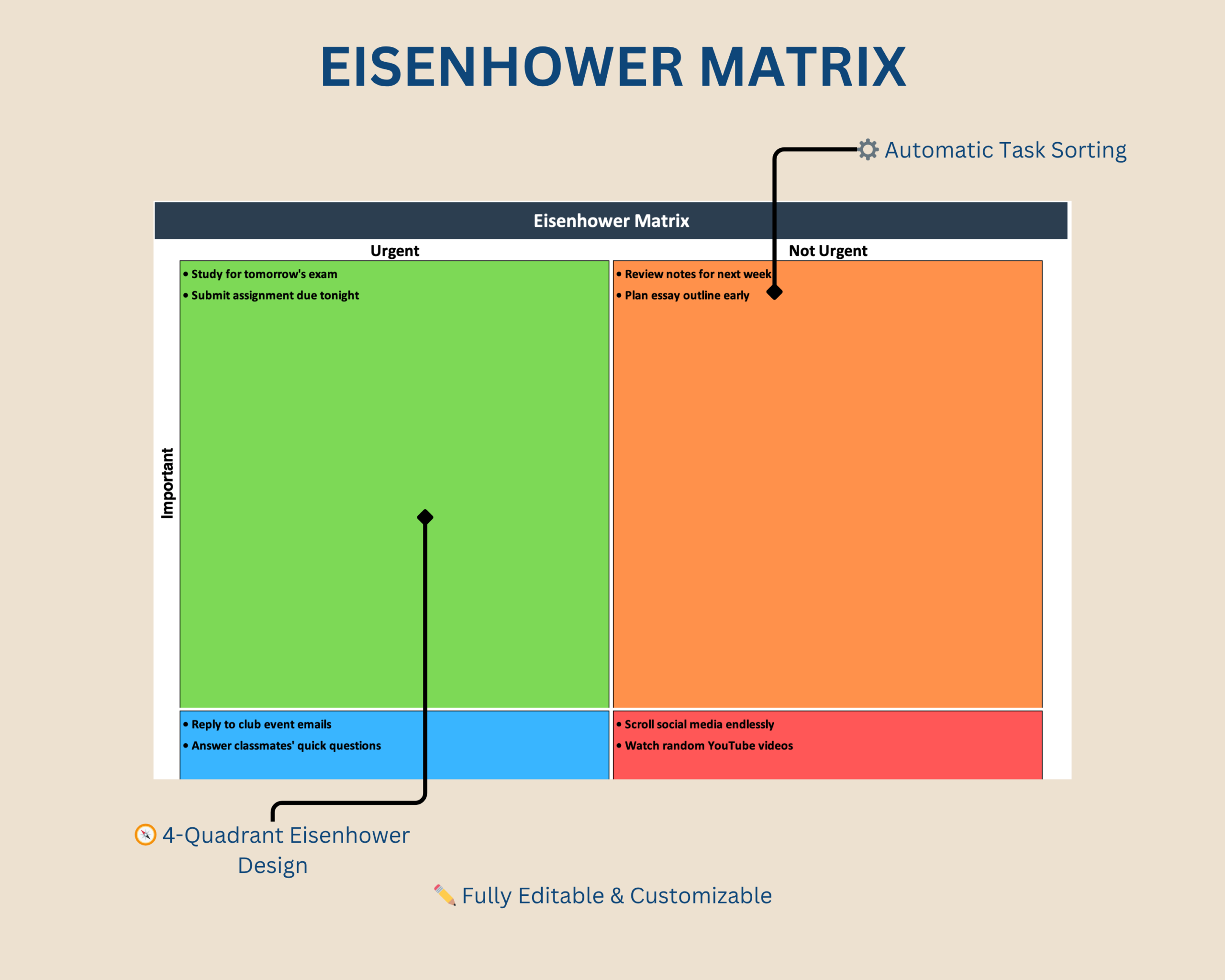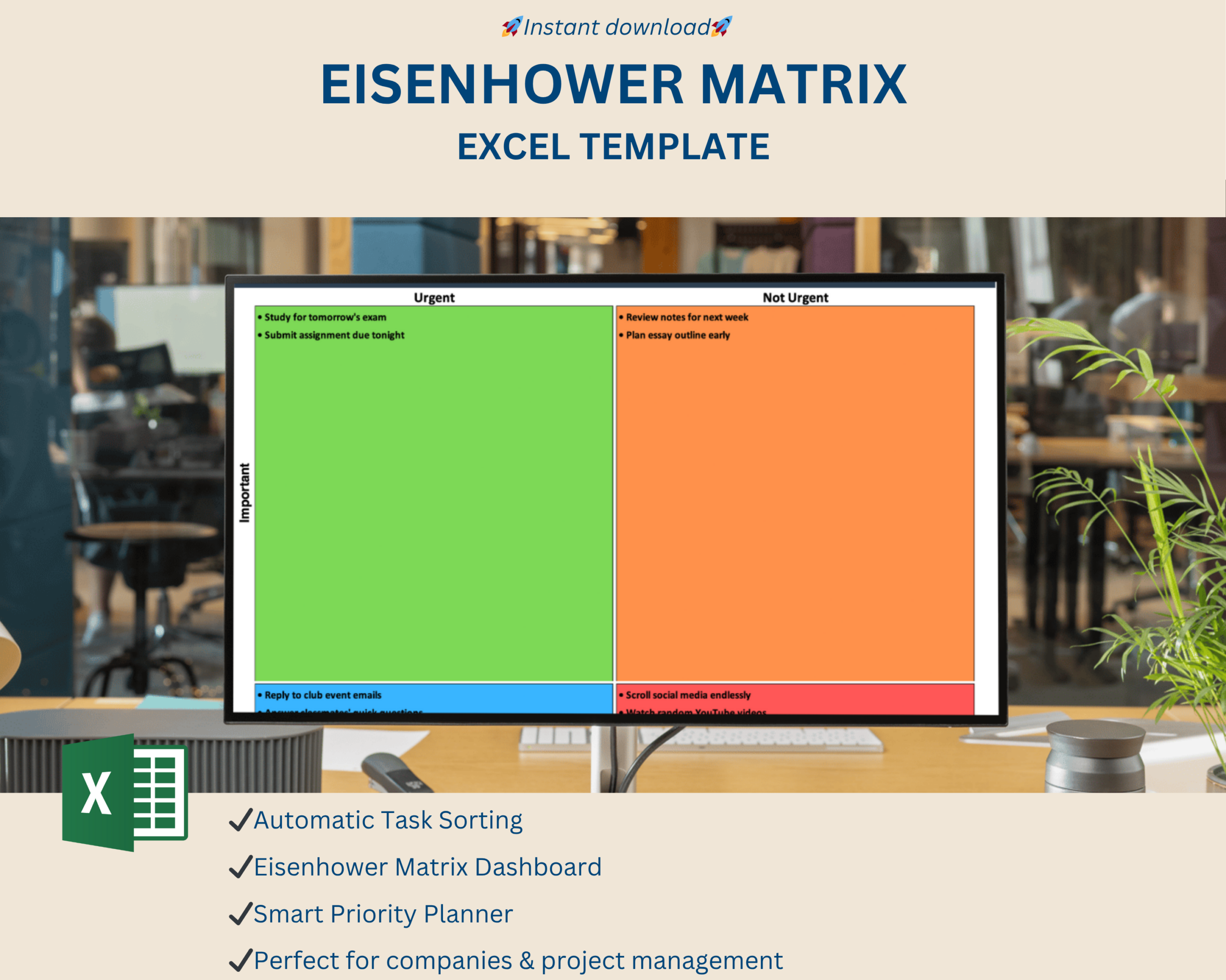 This interactive Excel template helps you organize tasks based on urgency and importance, following the classic 4-quadrant Eisenhower Method. Simply enter your tasks, set “Urgent” and “Important” via dropdown, and watch them appear automatically in the correct quadrant. The clean layout and color-coded design make prioritization simple and visual – ideal for students, professionals, or anyone who wants to manage time smarter.