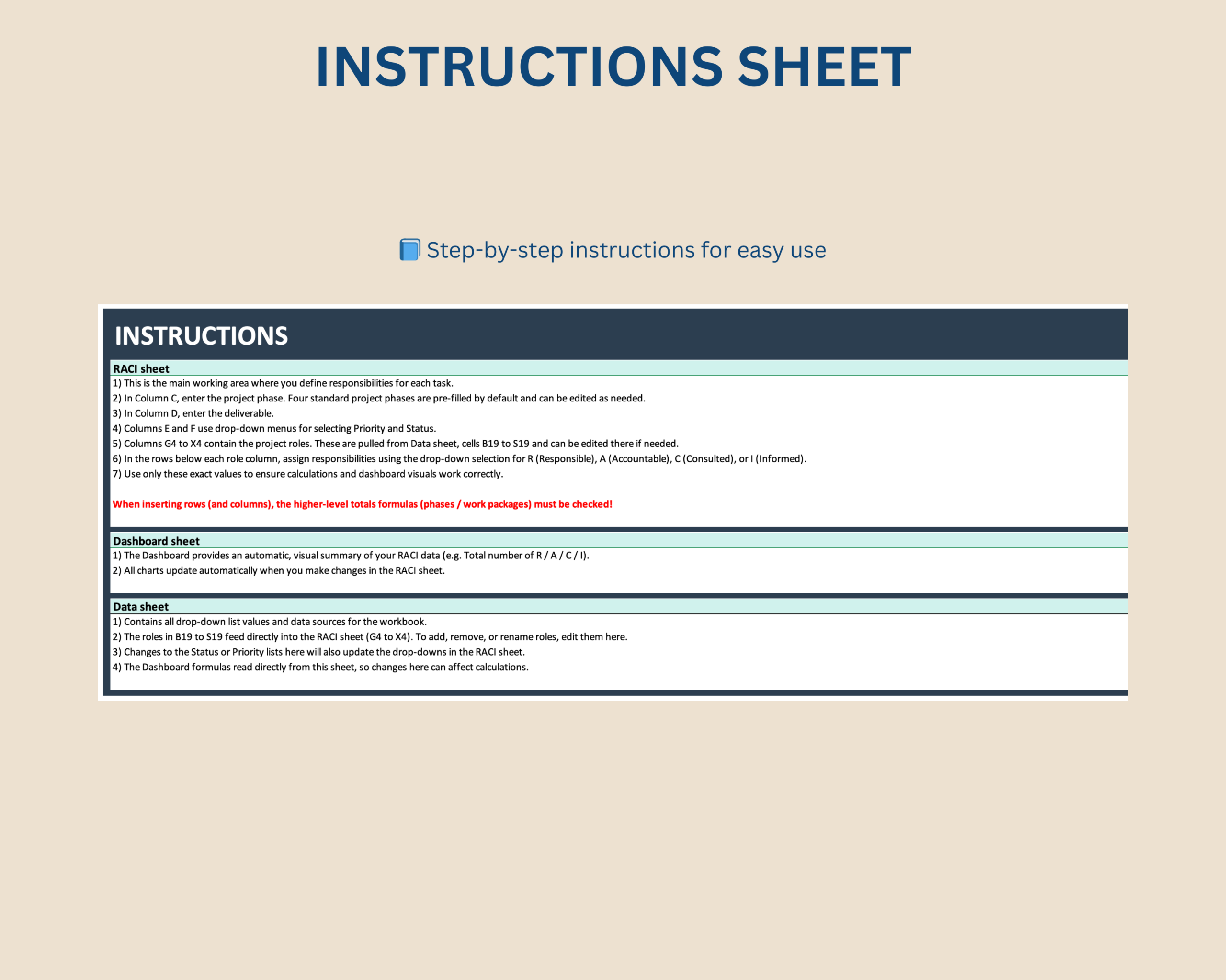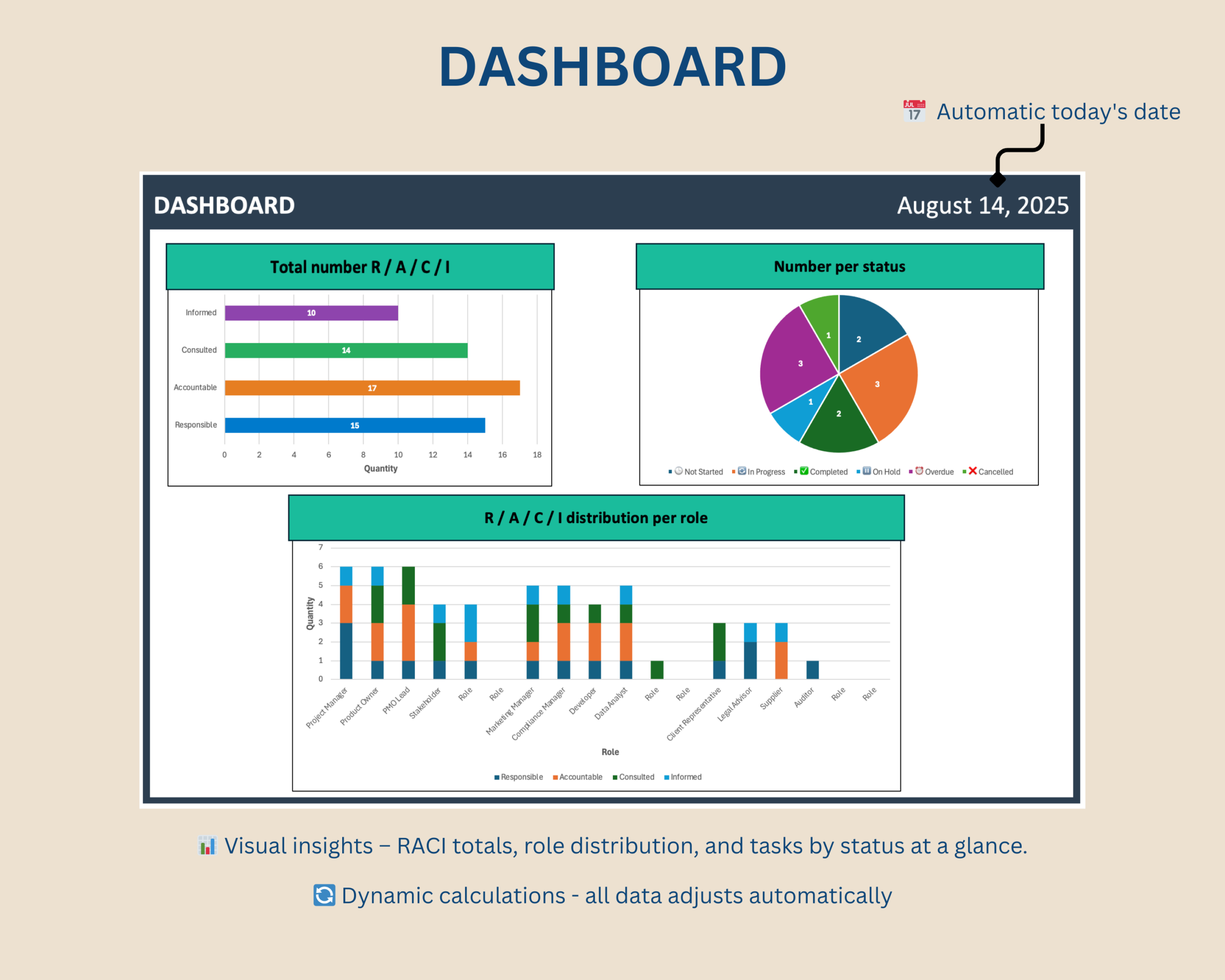- Automatic charts for RACI totals, role distribution & tasks by status