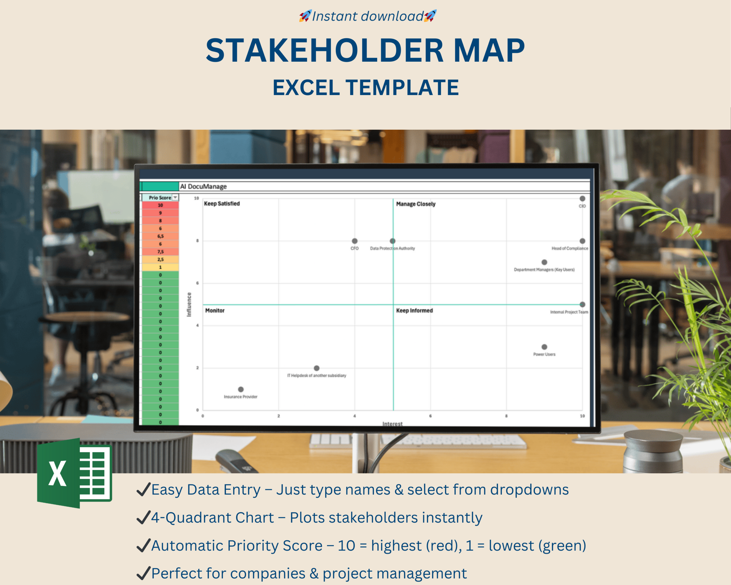 With this fully customizable Excel template, you can map stakeholders by influence and interest, calculate automatic priority scores, and visualize them instantly in a color-coded 4-quadrant chart. Perfect for project managers, consultants, and teams who want to keep stakeholder management clear and effective.