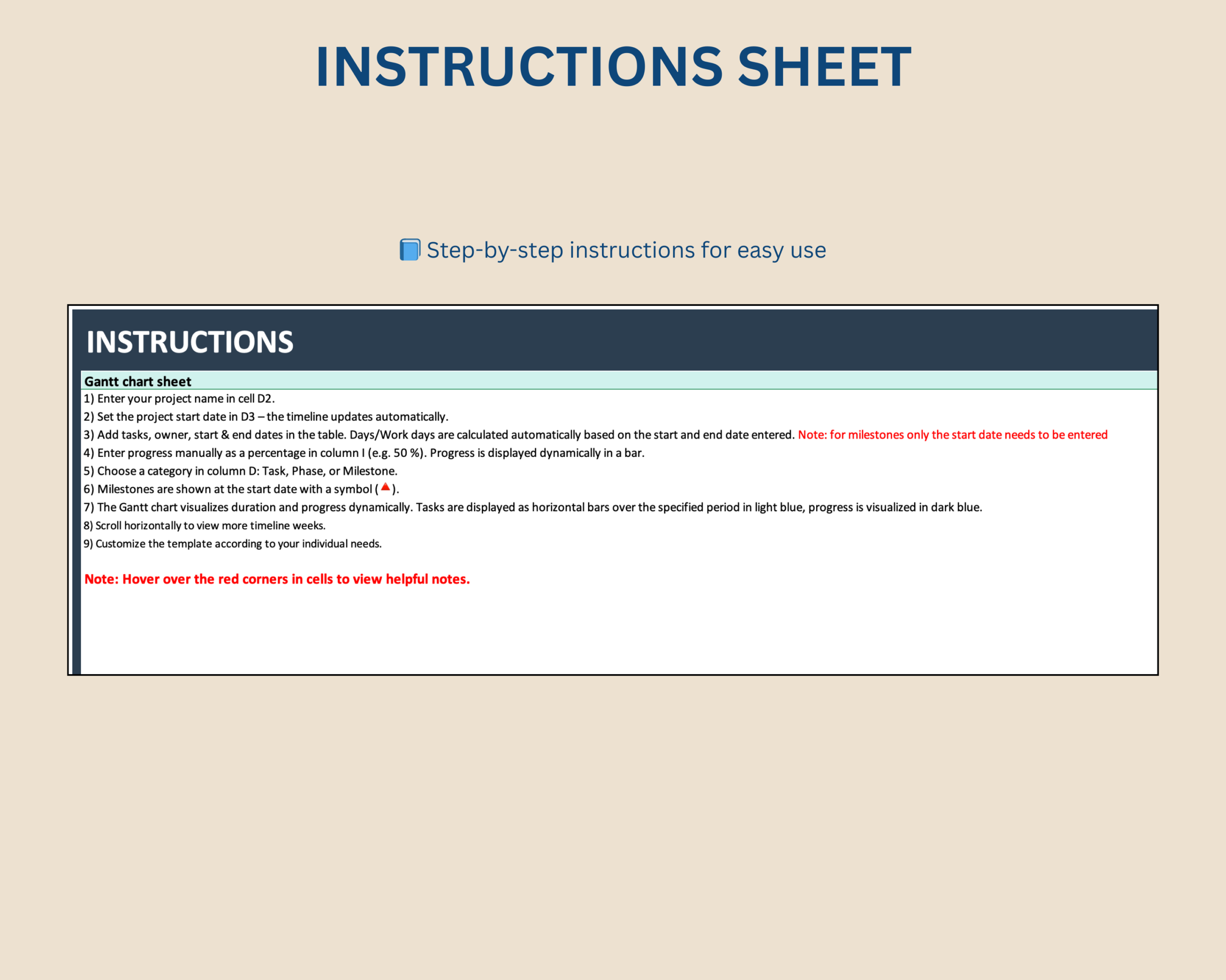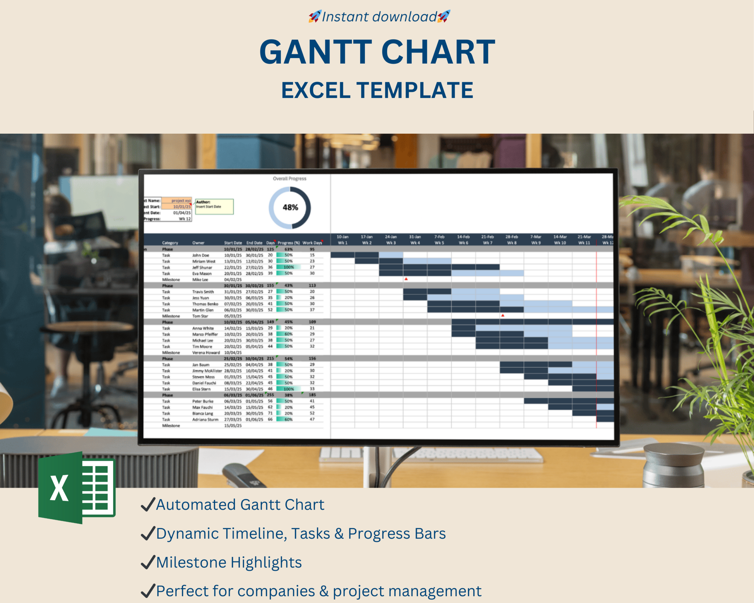 With this dynamic Excel template, you can plan, manage and track your projects in a clear and professional way. Tasks, phases and milestones are visually displayed in an automated timeline. Progress bars update instantly – including real-time KPIs and milestone symbols.